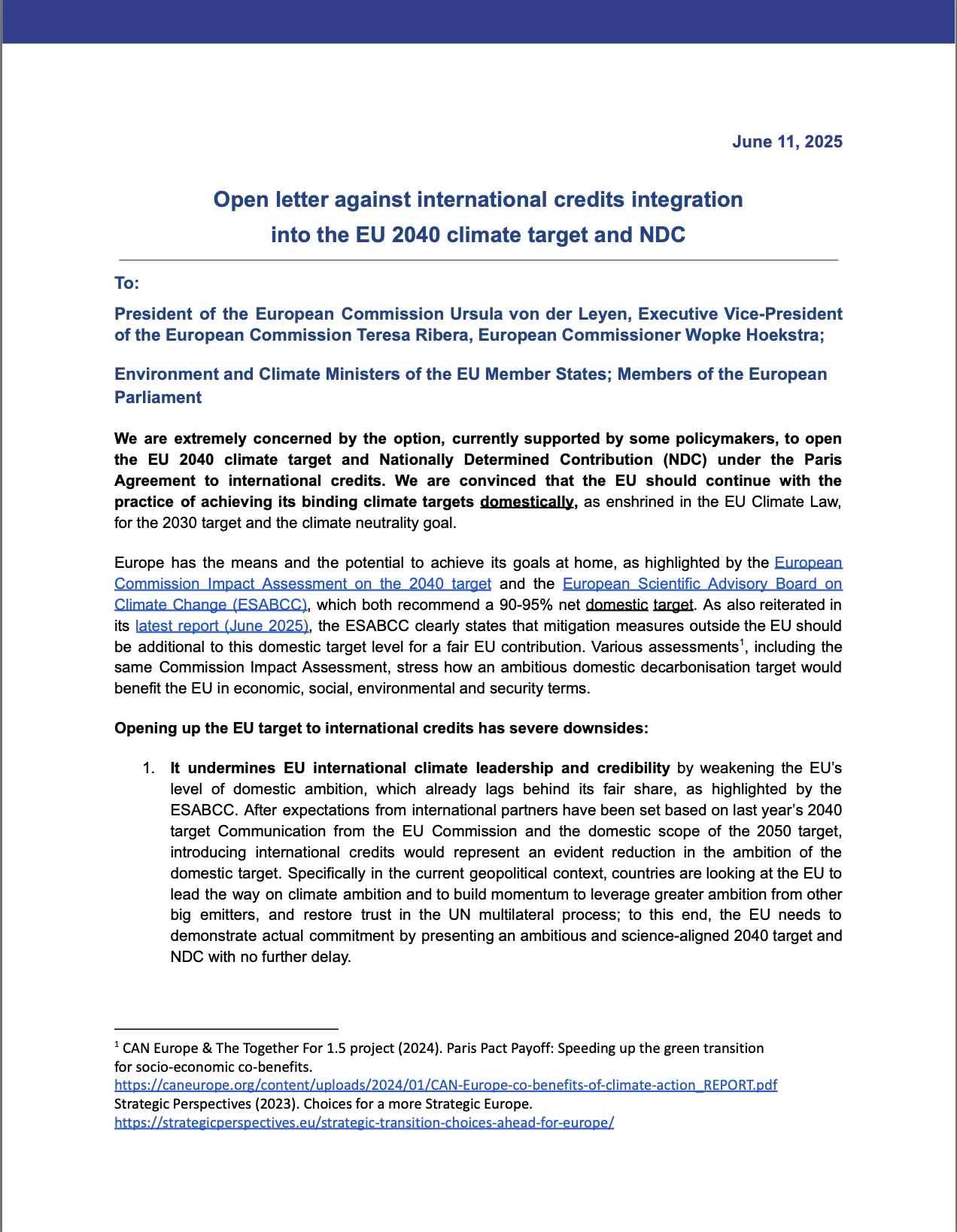 The signatories warn that shifting from domestic action to external offsets risks weakening EU climate ambition, undermining international credibility, and delaying essential structural change. The letter calls for a fully domestic, science-aligned target of at least 90% net emissions reductions by 2040.