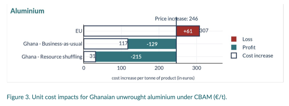 Ghana aluminium exports consistently record net financial gains, as EU price pass-through exceeds the value of CBAM certificates. This remains true even after implementing a development plan that is not particularly aimed at reducing climate impacts.