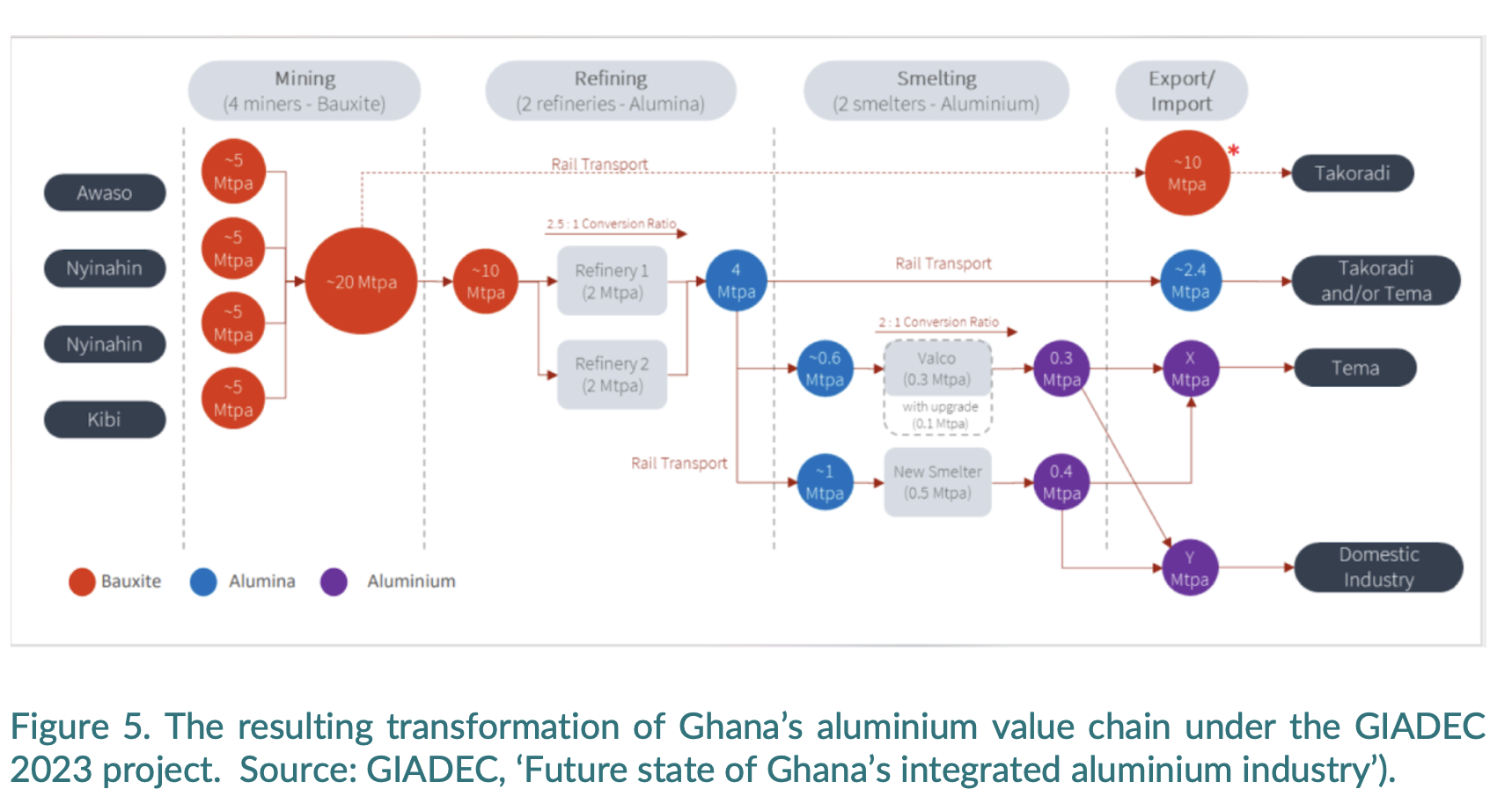 Under the Ghana Integrated Aluminium Development Corporation (GIADEC) project, domestic refining and smelting capacity is expected to expand significantly. In particular, aluminium smelting capacity is assumed to increase from approximately 200 kt to 800 kt, supported by the development of new refineries and smelters.