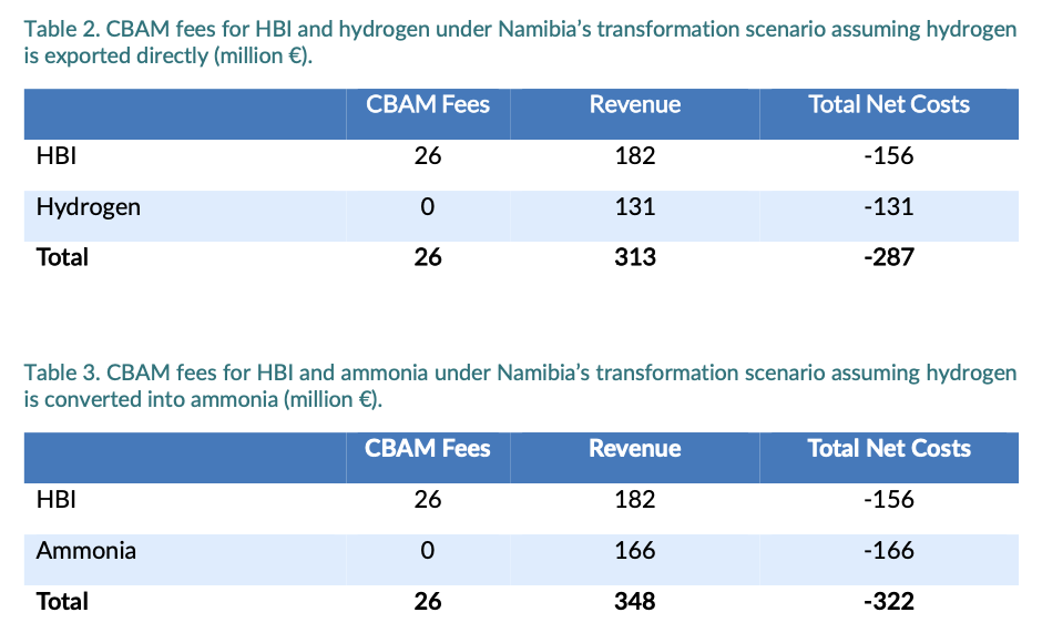 The CBAM’s impact on Namibia’s development projects would be very positive, thanks to very low CBAM fees and CBAM goods selling at substantially higher prices in the EU. The CBAM would in effect support investment in those projects. Extension of the CBAM to cover indirect emissions would have no extra impact if Namibia’s hydrogen is produced from renewable electricity.