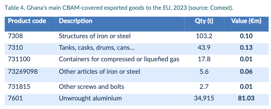 Ghana’s exposure to the EU Carbon Border Adjustment Mechanism (CBAM) is highly concentrated and overwhelmingly shaped by a single product: unwrought aluminium. In 2023, aluminium exports to the EU amounted to around €81 million, while CBAM-covered steel exports (the second largest CBAM-covered exports) were much smaller, at approximately €0.3 million.