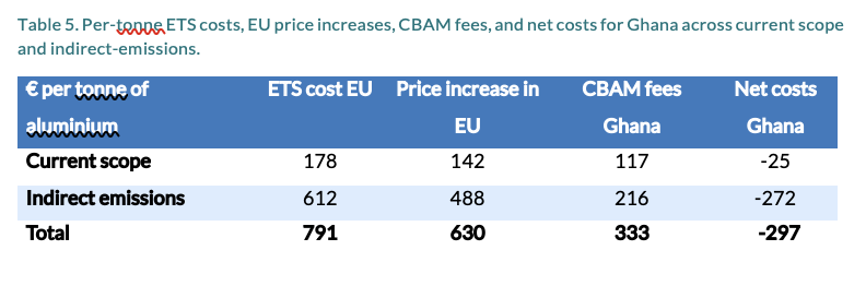 If the additional aluminium production were exported to the EU, CBAM fees applied to Ghanaian exports would amount to €74 million under the current CBAM scope, while EU price pass-through would raise export revenues to around €156 million, resulting in an overall net gain of €82 million. If indirect emissions were included in the CBAM, CBAM fees would rise to €211 million (instead of €74 million), but higher EU price pass-through would more than offset this increase, leading to a net gain of €256 million per year.