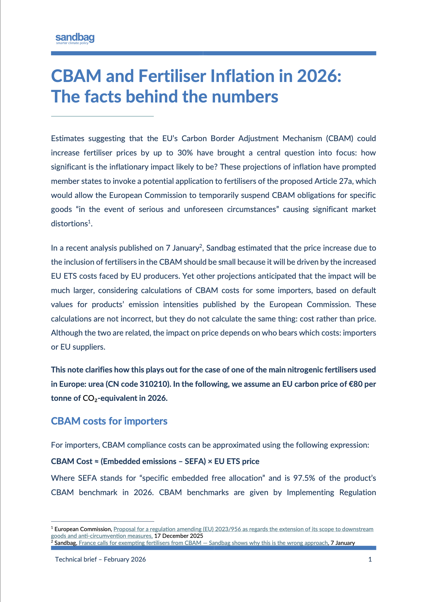 This note clarifies how this plays out for the case of one of the main nitrogenic fertilisers used in Europe: urea (CN code 310210). In the following, we assume an EU carbon price of €80 per tonne of CO-equivalent in 2026.