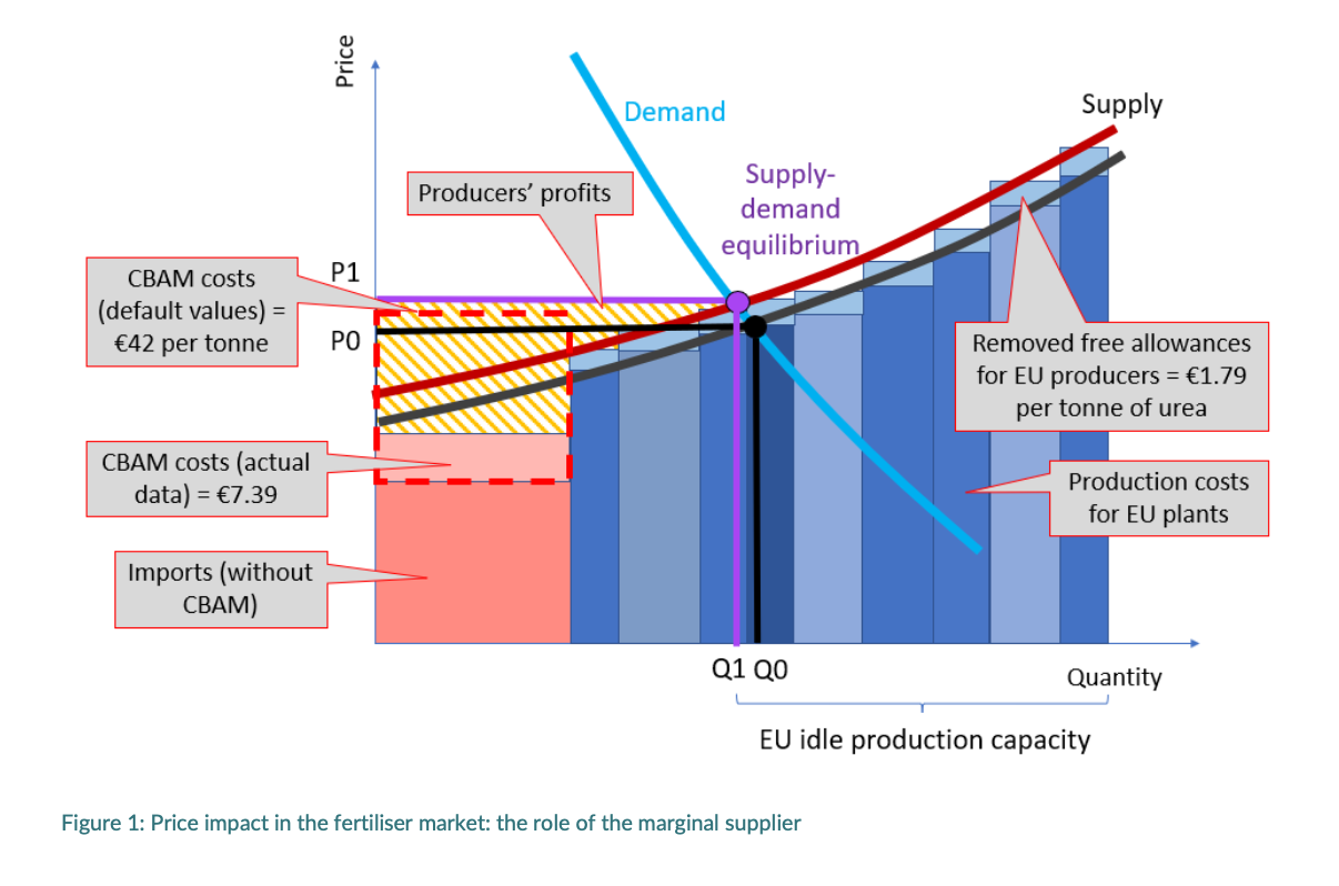 On the contrary, cheaper imports (from countries with cheap natural gas and labour) are unlikely to drive prices up, because the addition of CBAM costs, even if they are higher than EU ETS extra costs, will probably not make the total cost of imports exceed that of the marginal EU plant. If EU producers, who already face EU ETS obligations and often operate with tighter margins, remain price-setting, fertiliser prices are more likely to be driven by domestic carbon costs than by CBAM-related costs on imports.