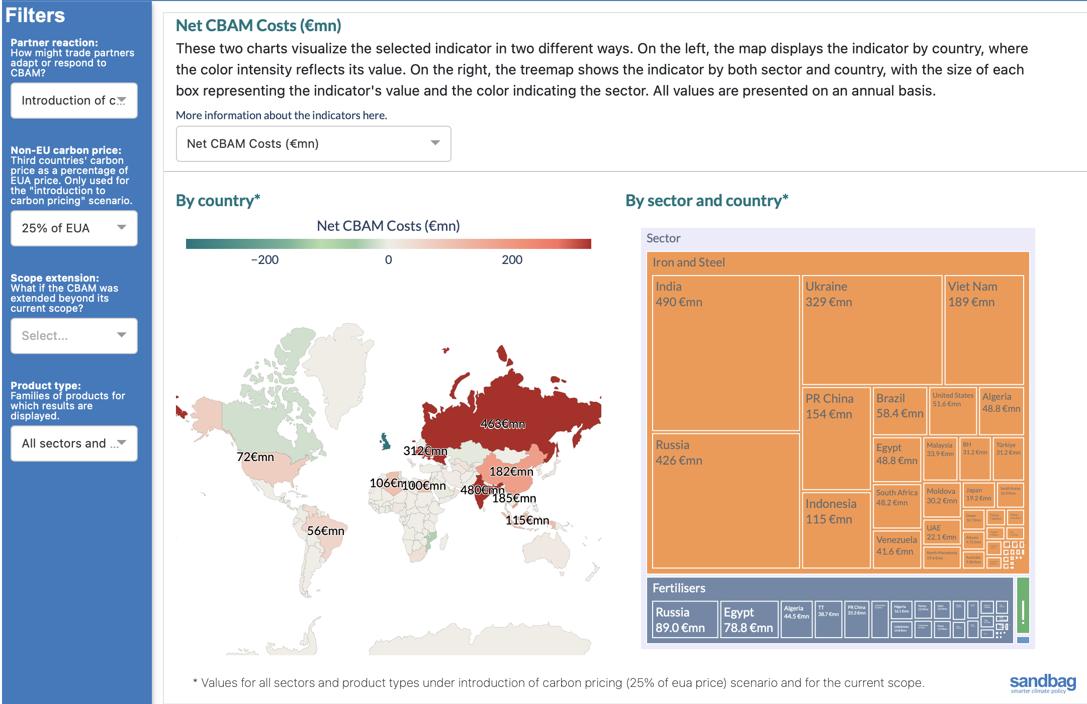 Explore how CBAM affects countries and sectors under different assumptions. Compare scenarios, see net costs, and export results
